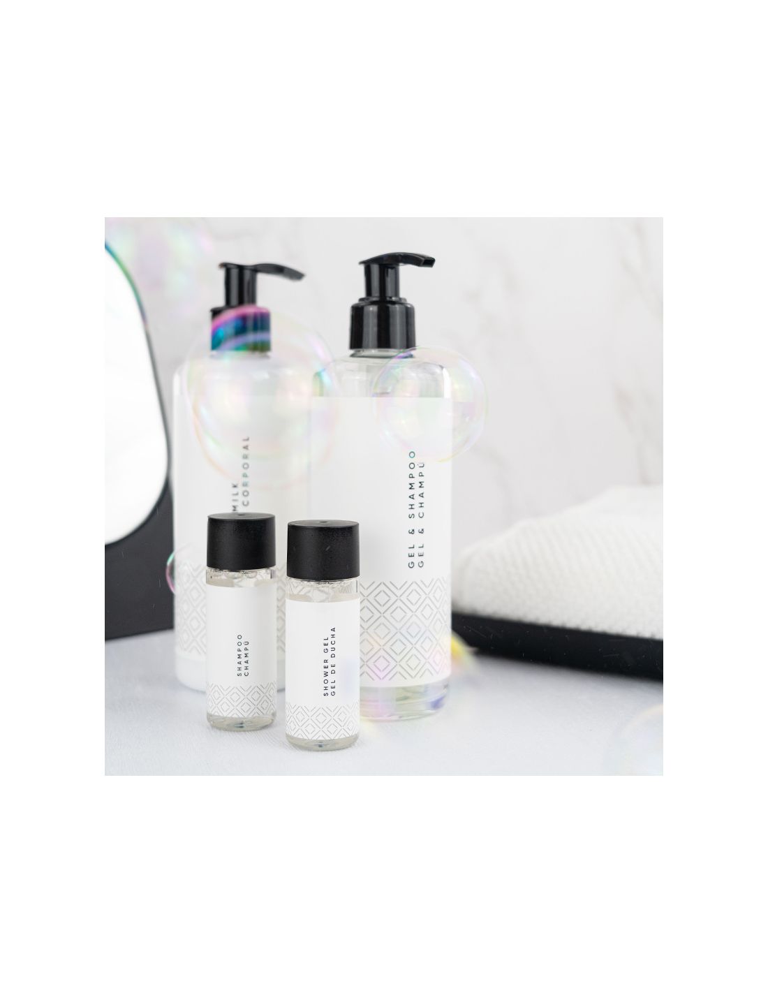 Además, su packaging está fabricado con plástico 100% reciclado y es completamente reciclable, promoviendo la economía circular y el uso responsable de los recursos del planeta. Perfectos para ofrecer una experiencia de bienestar y sostenibilidad en cada estancia.