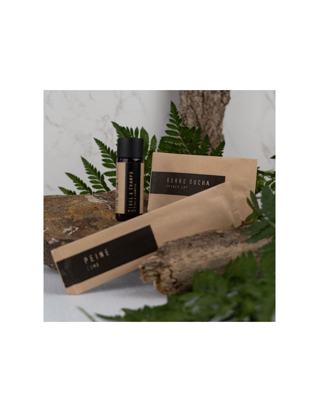 Los complementos de la colección de amenities Wengue están producidos con materiales y productos naturales y ecológicos especialmente escogidos para colaborar en la reducción del consumo de plásticos y el consumo responsable. El paquete de este kit dental està fabricado en papel kraft, cartón reciclado.