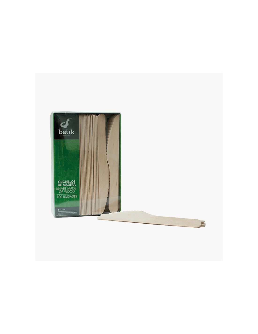 Cuchillos de madera de 16,5 cm de longitud que se incluyen en cajas de 100 unidades. Con un espesor de 1,8 mm.
