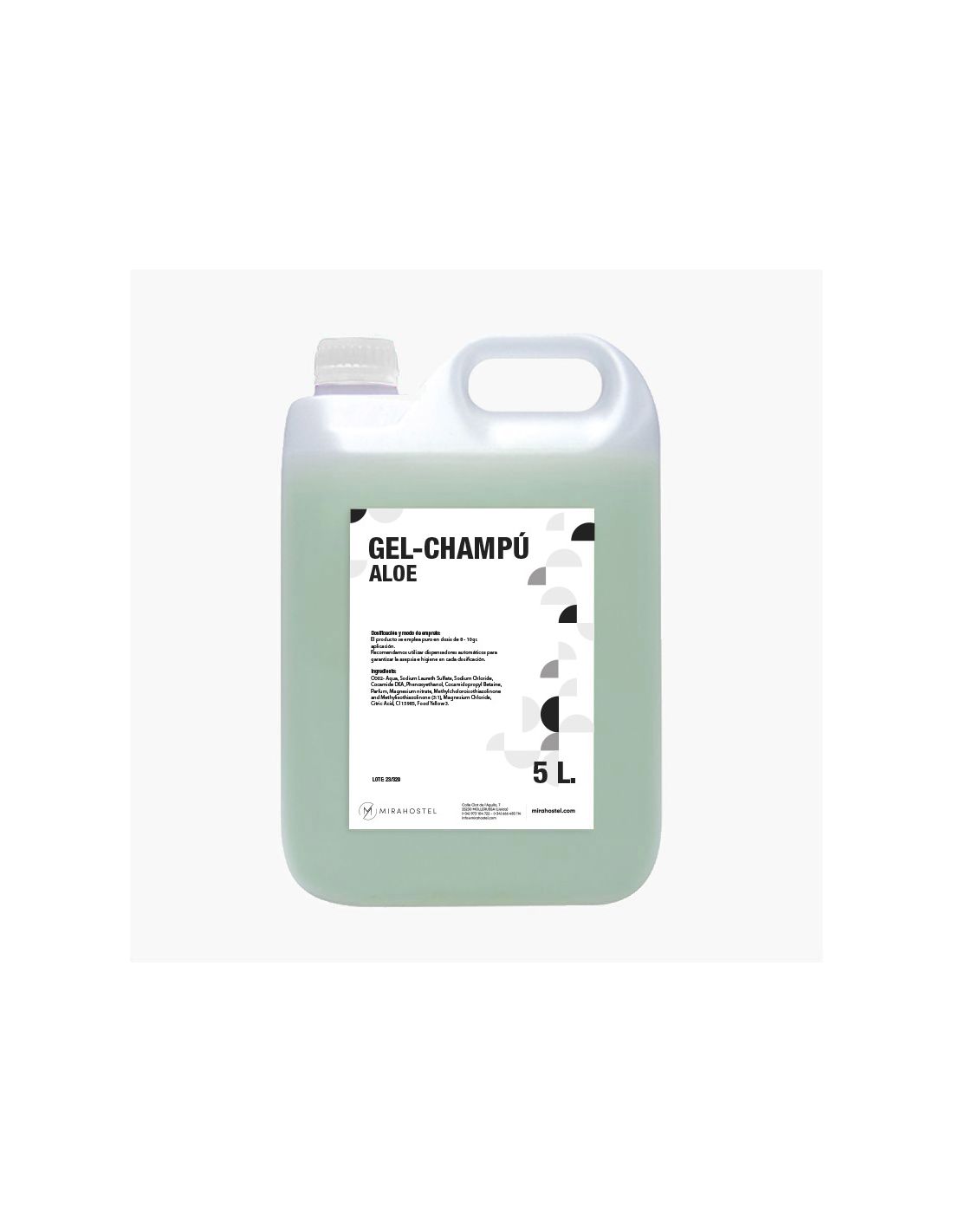 Gel de baño y champú de Aloe Vera en garrafa de 5 litros con un envase ideal para su utilización.