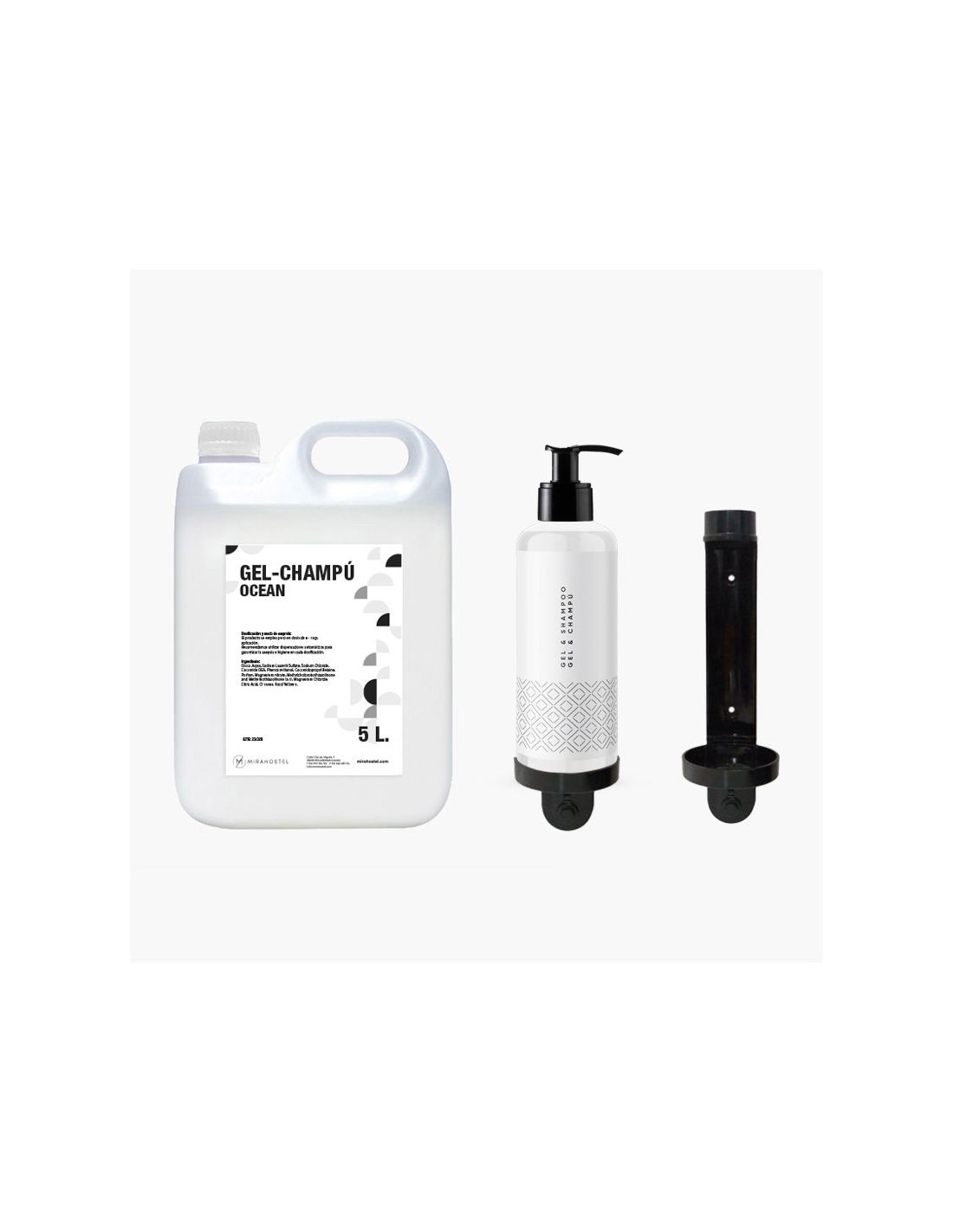 Pack compuesto por 24 Botellas Gel y Champú 2 en 1 en botella dosificadora de 300ml con un diseño muy actual y elegante, 4 Garrafas de Gel y Champú Ocean de 5 litros, 4 soportes de pared para las botellas de 300ml.