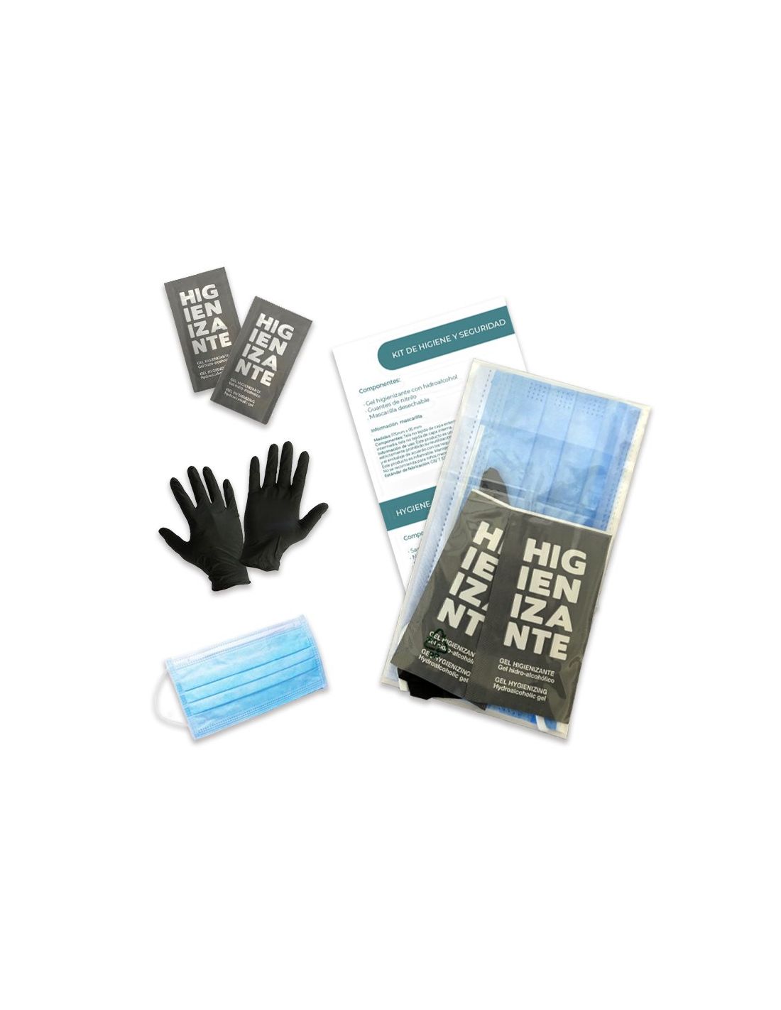 El kit esta compuesto por una mascarilla quirúrgica de triple capa y con certificado CE, un par de guantes de nitrilo y 2 sobres de gel higienizante con hidroalcohol.