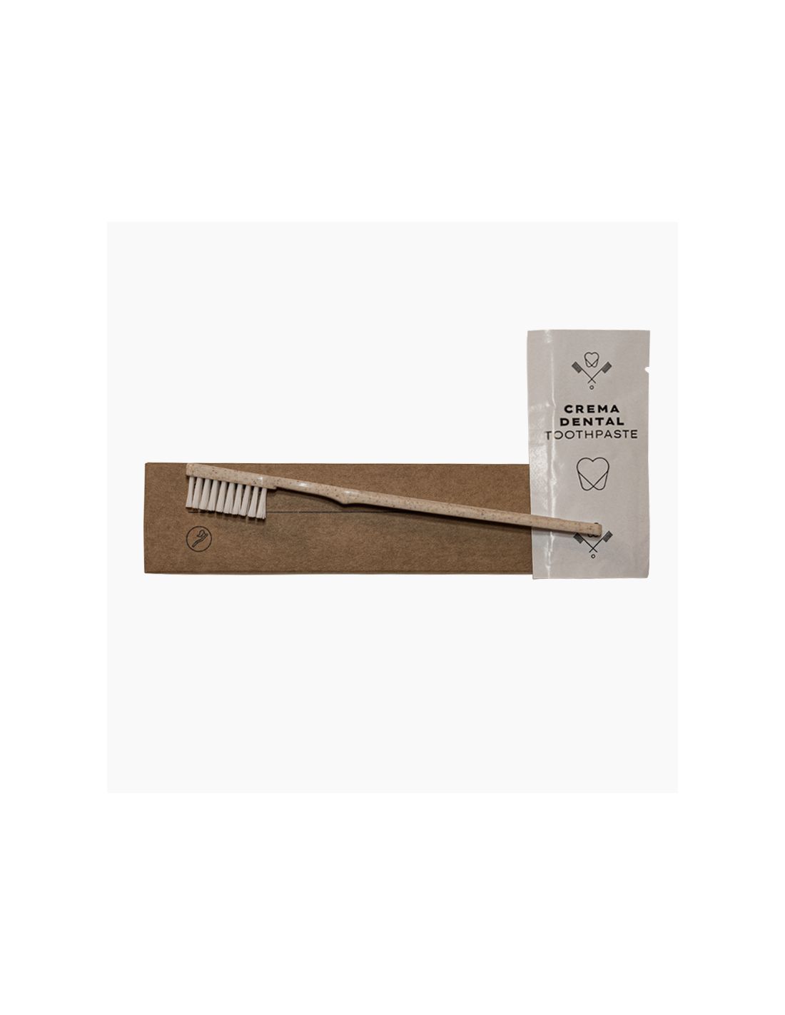 Kit dental formado por un sobre de pasta de dientes y un cepillo de dientes, ambos con un diseño sostenible. Este kit resulta perfecto para ofrecer a los huéspedes dentro de las habitaciones de un apartamento, una casa rural o un hotel.