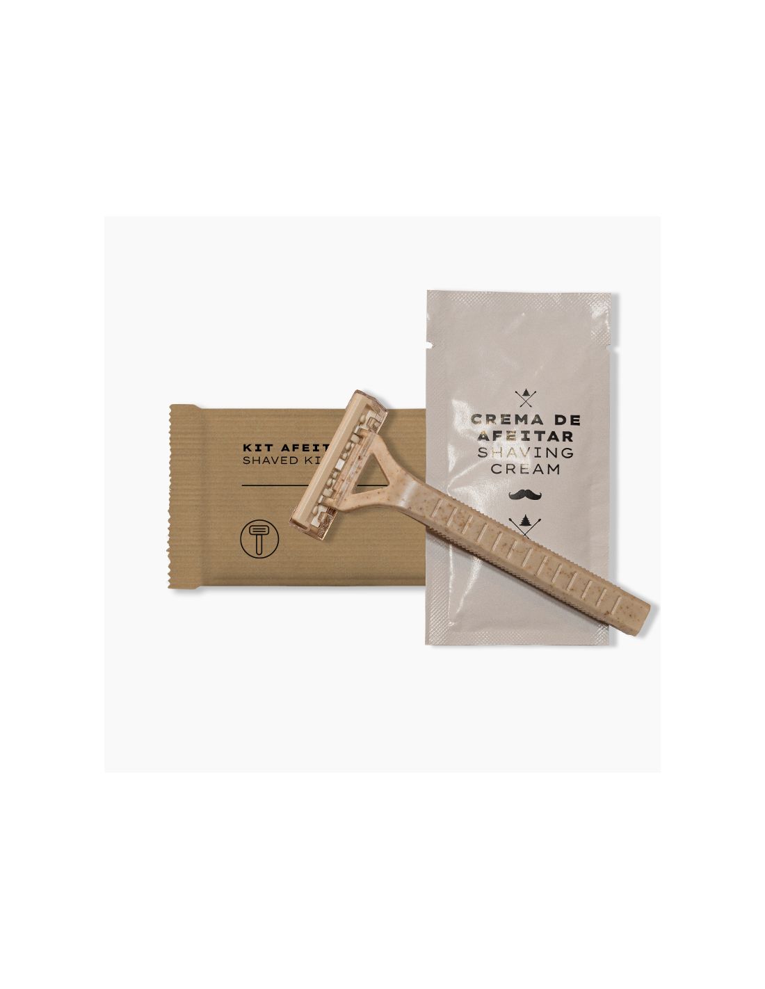 Kit de afeitado formado por un sobre de crema de afeitado y una maquinilla de afeitar desechable. Todo ello se encuentra envasado en un blíster de papel reciclado con un diseño actual y muy elegante.