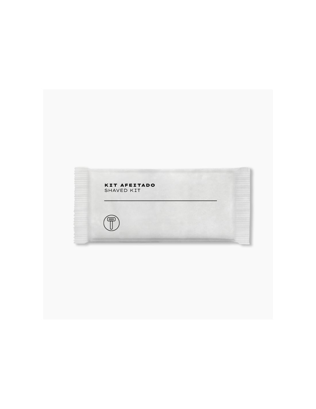 Kit de afeitado formado por un sobre de crema de afeitado y una maquinilla de afeitar desechable. Todo ello se encuentra envasado en un blíster de papel con un diseño actual y muy elegante.
