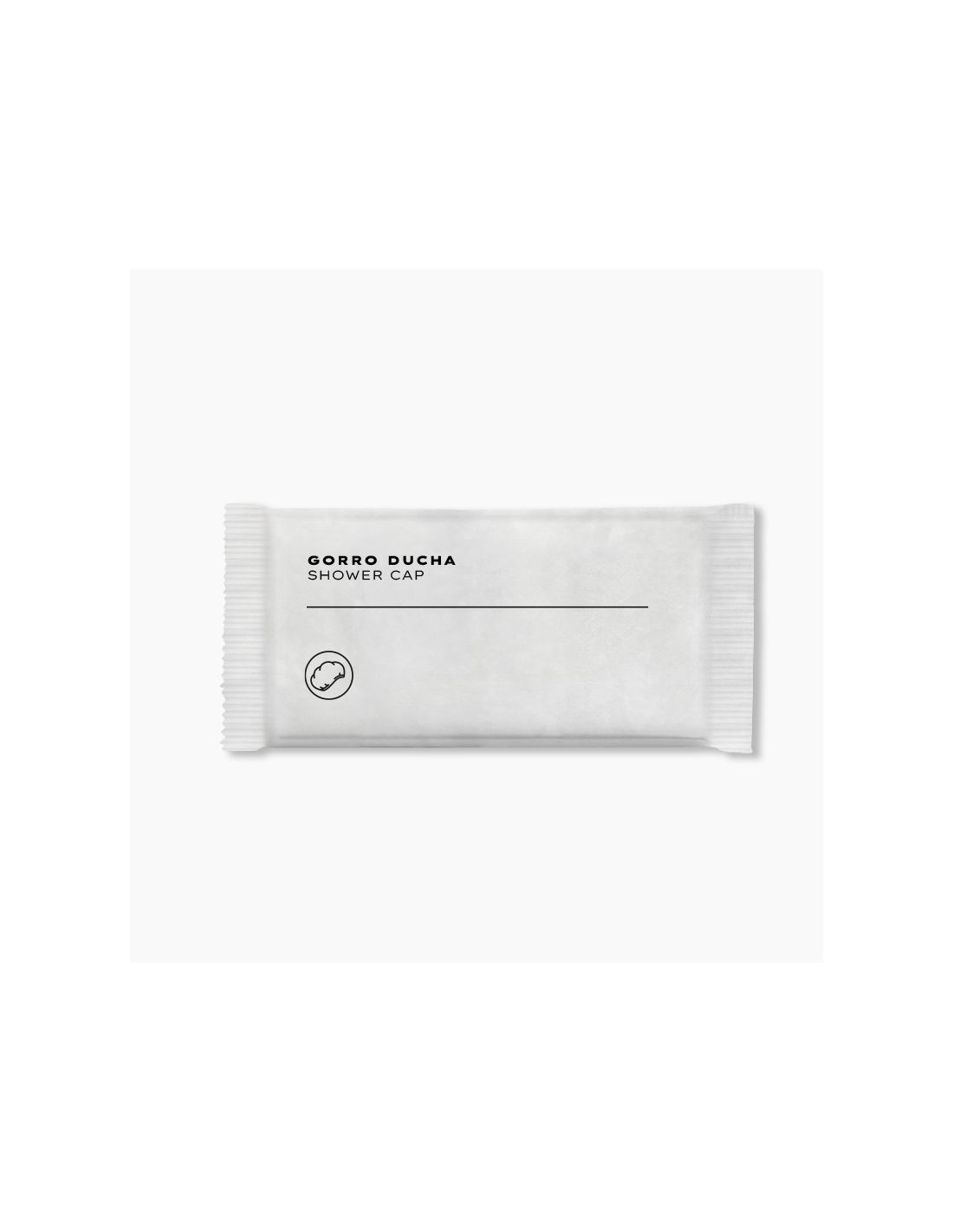 Gorro de ducha de plástico que se incluye dentro de un pequeño blíster de papel. Perfecto para incluir con el resto de amenities de higiene que queramos ofrecer a los huéspedes de nuestra casa rural, apartamento vacacional u hotel.
