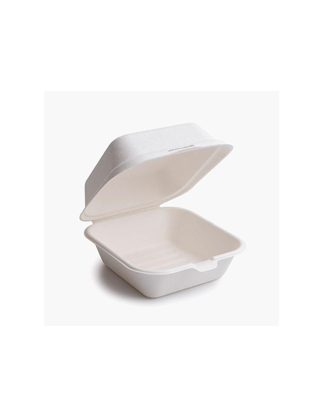 Envase fabricado con caña de azúcar. Completamente ecológico y 100% biodegrable y compostable, por lo que pueden ser desechados después de su uso. Los comercializamos en paquetes de 25 envases con capacidad para una hamburguesa