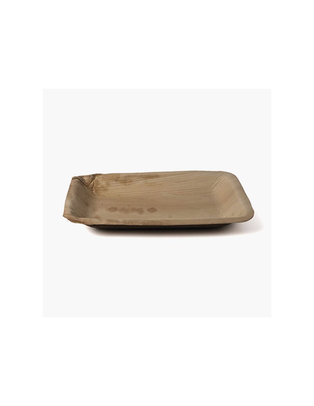 Plato rectangular de 25x16cm. Fabricado con hoja de palma y sin ningún tipo de sustancia tóxica para la salud. Los comercializamos en bolsas de 25 unidas a un precio muy competitivo.